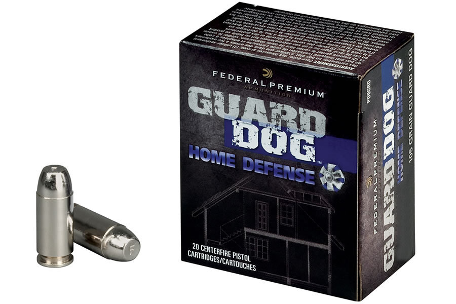 Federal Premium Guard Dog Home Defense rounds are specially developed for home protection use. Featuring a patented EFMJ construction, this bullet is filled with expanding polymer that minimizes over-penetration through interior walls. High velocities, low recoil and reliable feeding make Guard Dog a favorable choice for defending home and family.
