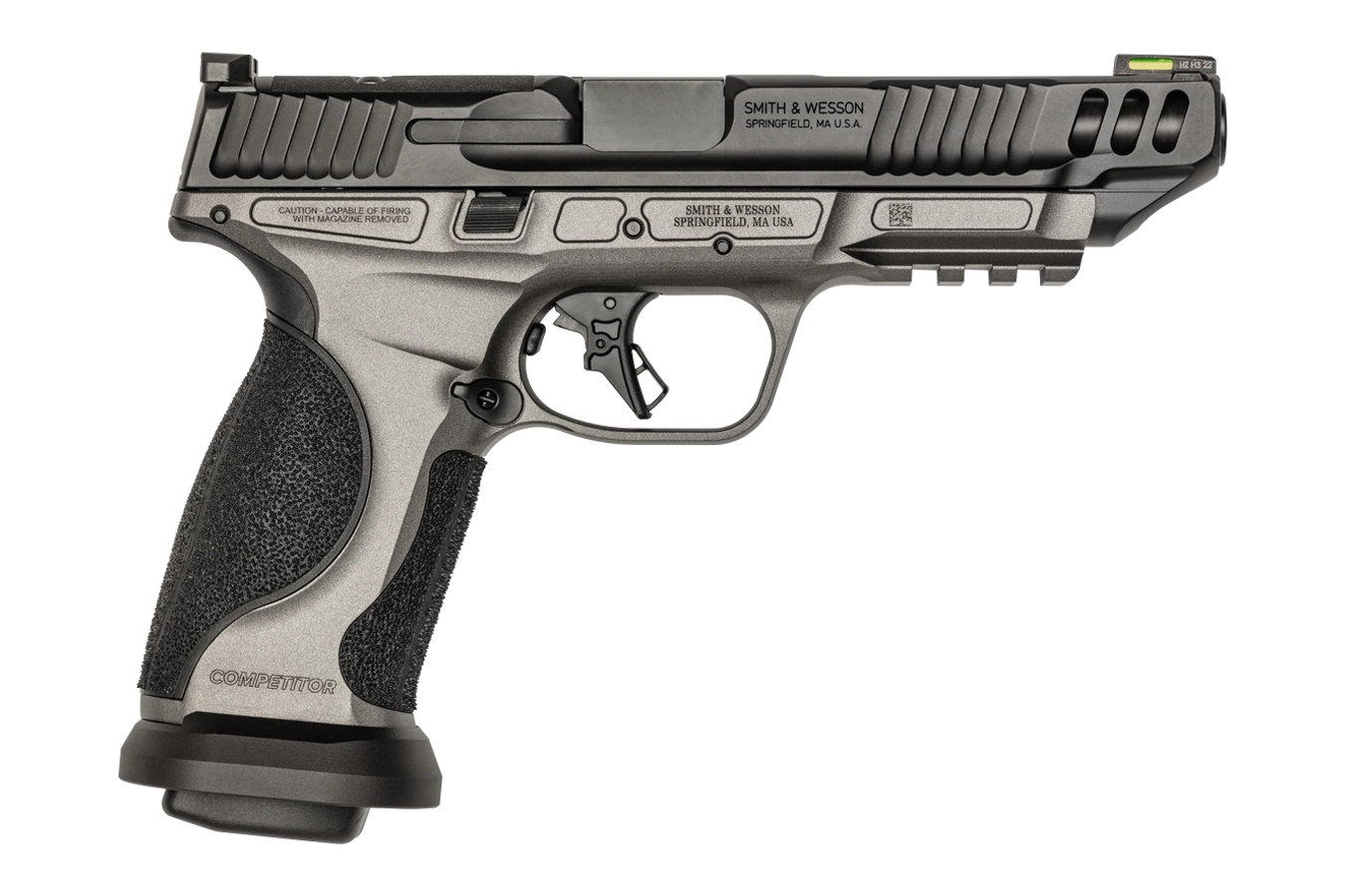 The slide is cut for optics, includes a fiber optic front sight, and blacked out serrated rear sight. The Competitor comes with an oversized mag release that is reversible for both right and left-handed users and ships with a total of four magazines. Smith & Wesson is proud to introduce the Performance Center M&P9 M2.0 Competitor.