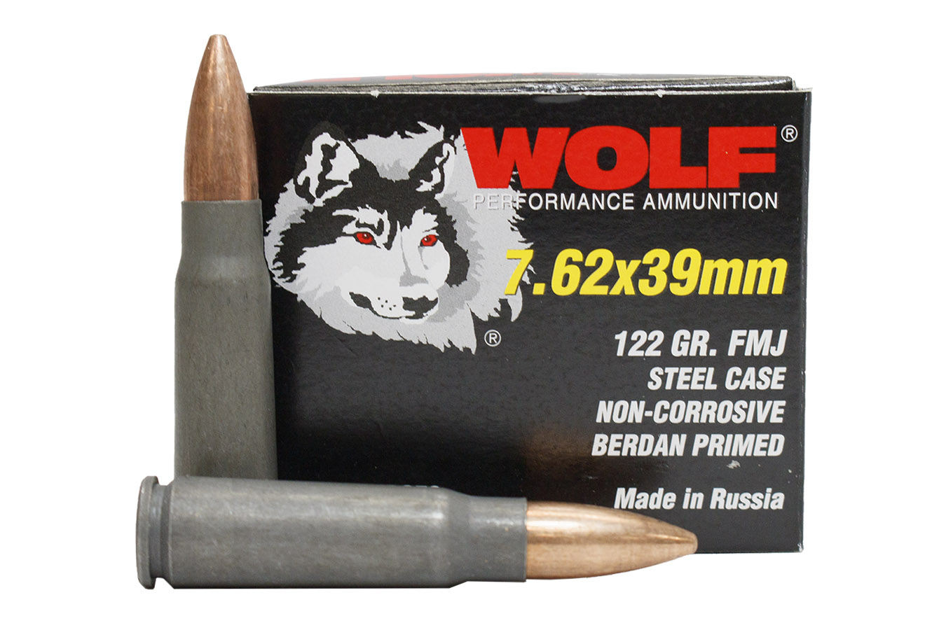 Wolf Performance Ammunition features a specially formulated coating that ensures smoother feeding and extraction. This line is available in several calibers for recreational, competitive, and tactical shooting enjoyment. This particular SKU is the 7.62×39 caliber, 123 Grain FMJ. It is 100 % non-corrosive. clean-burning and surefire. Wolf ammunition is known worldwide for its reliability and performance.